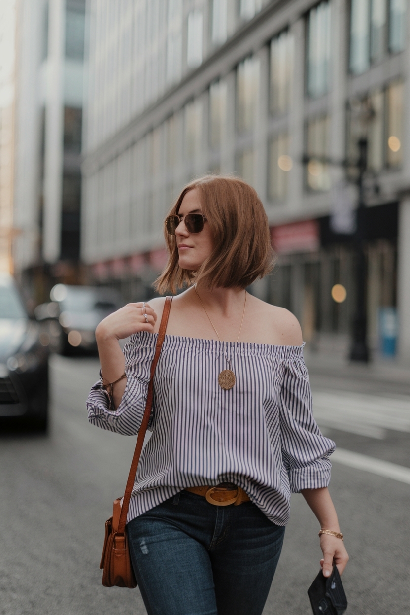 Creating a trendy outfit with a DIY off the shoulder shirt is both easy and stylish. Whether you’re heading to a casual brunch or a summer festival, this look can be adapted for any occasion. Here are some styling tips: