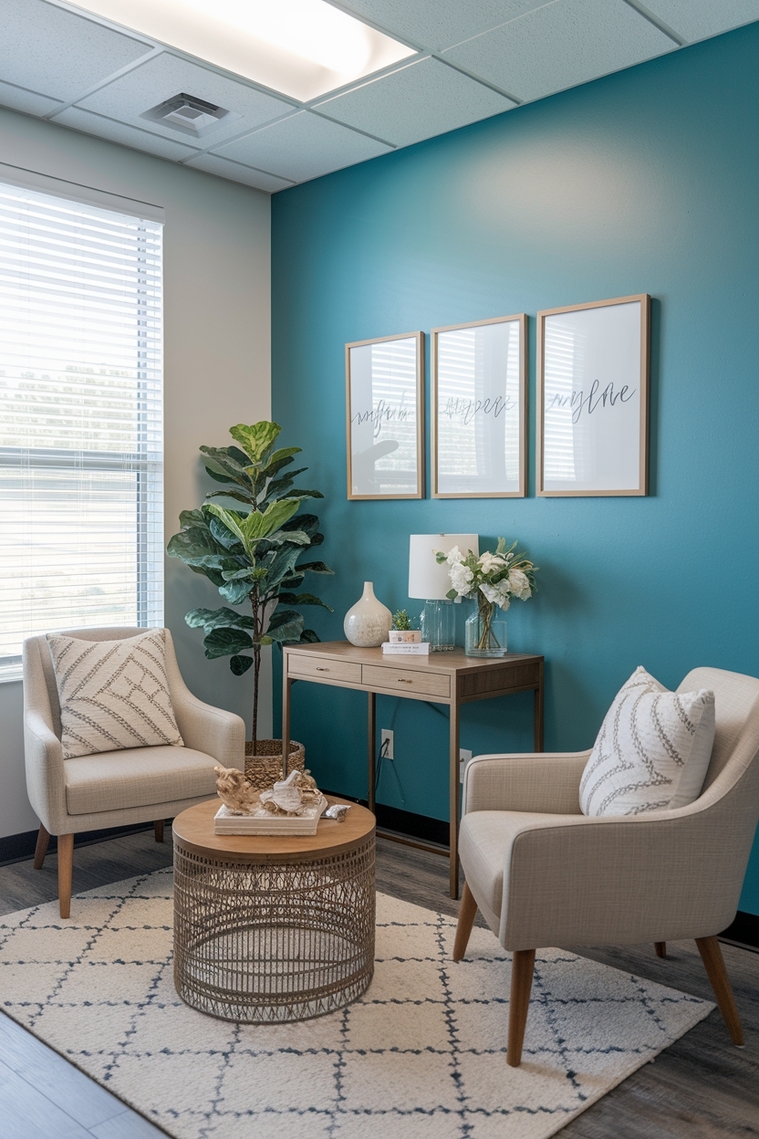 In a counseling office, it’s important to focus on creating a welcoming and safe environment. Consider comfortable seating, a calming color scheme, and adequate lighting. Personal touches, such as books or artwork, can also contribute to a more inviting space.