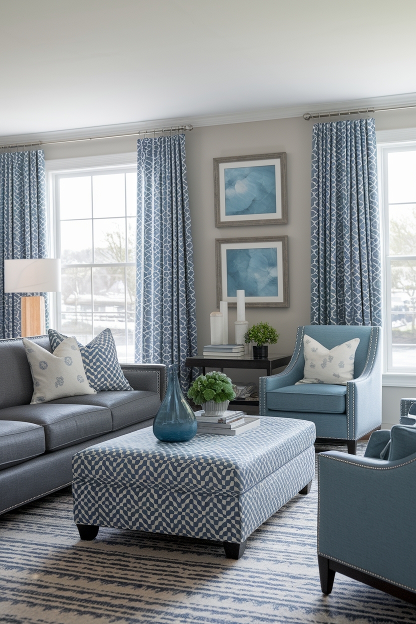 - Textiles: Use plush gray sofas paired with blue throw pillows for contrast.